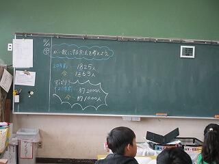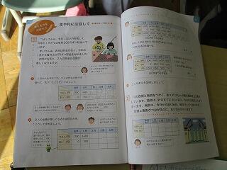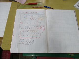 4年1組 算数「概数」概数にするためにはどうしたらよいか考える学習です。数直線を使えば、どちらの数に近いかで概数がわかることを説明していました。4年生になりノートの記入も大変よく整理されています。