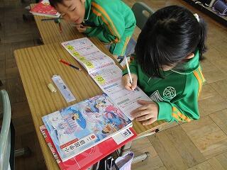 2年1組 国語「漢字」新出漢字の学習です。漢字ドリルを使って読み方や筆順、使われ方などを確認しました。漢字の間違い探しの問題では、どこに違いがあるのかすぐに見つけることができました。