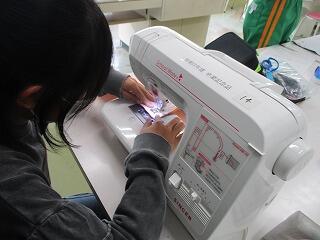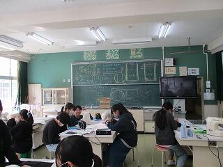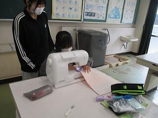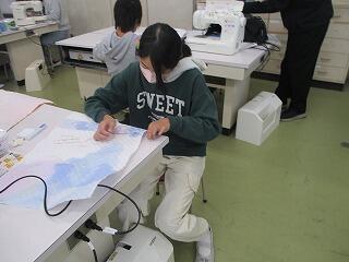 6年2組 家庭科「裁縫」ミシンを使ってトートバックやナップザックを作成しています。作り方を見て縫う場所に印をつけた後、マッチ針で止め、ミシンで縫っていきます。6年生は昨年も経験しているので、作業も手際よく進めることができています。