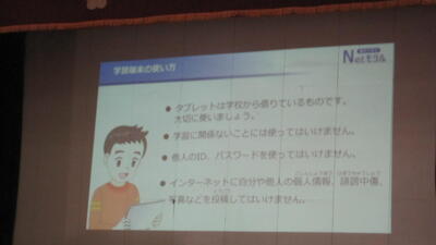 一人一台端末の使い方、約束などを楽しいスライドで発表してくれました。