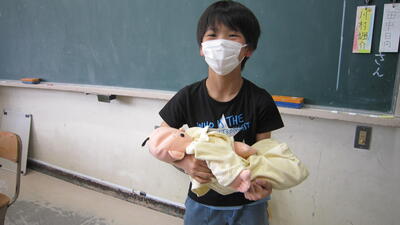 赤ちゃんと同じ体重のお人形です。だっこ、上手ですね。