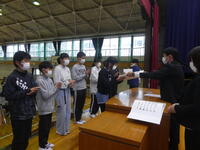 卒業を迎える6年生に、プレゼントの贈呈と表彰がありました。野田地区更生保護女性会様からは、児童一人ひとりに本にはさむ栞をいただきました。(写真は学級代表の児童です。)また、あおいそら運動推進委員会南部支部様より、6年間の皆勤賞として記念品をいただきました。中学校でも読書に親しんだり、元気に学校生活を送ったりすることができるといいですね。