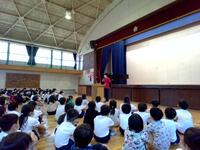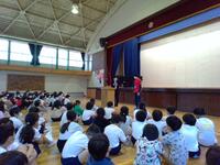30日(金)に、7月分の全校集会を行いました。まず、児童会、生活委員会、整美委員会から、あいさつや廊下の歩き方、掃除のやり方などについて、発表がありました。はきはきと自分からあいさつをすることで、お互いに気持ちよく生活ができること、廊下を走るとケガをしてしまうこと、正しいぞうきんがけのやり方などを、劇を交えて楽しく発表することができました。