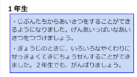 1年生は、朝の支度や、掃除の仕方、一緒にたくさん遊んでもらった思い出と感謝の気持ちを呼びかけと歌で表現しました。