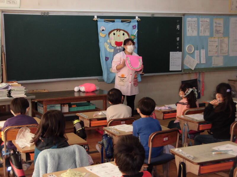 12月1日(火)に、野田市保健センターの歯科衛生士2名が講師となり、1年生歯磨き指導を行いました。乳歯から永久歯への生えかわりや汚れの付きやすいところなど、歯について詳しく説明していただきました。また、普段使っている歯ブラシをチェックしたり、難しい奥歯の磨き方を教わったりしました。