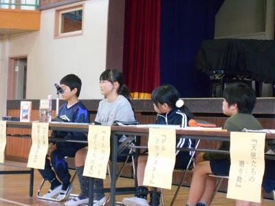 11月15日(水)にビブリオバトルの本戦が行われました。各学年からの代表がそれぞれの本の紹介をして会が進行しました。代表者も緊張した場面があり思うようにできたか心配のようでした。高学年は、話のタイミングや間の取り方など観客が引き込まれるような展開が見事でした。結果は、後日図書委員会より発表があります。
