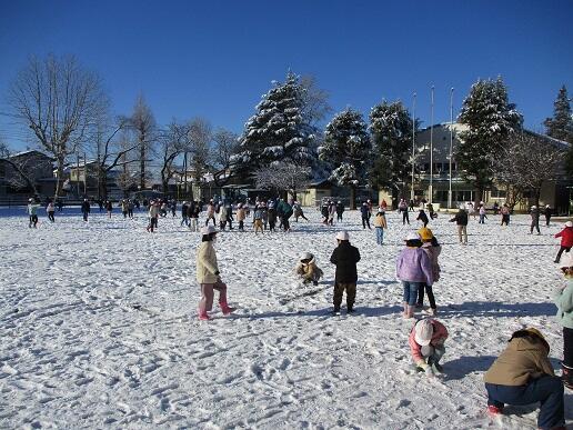 全校集会の後は、せっかく降った雪で学年ごとに時間を分けて遊びました。今回の雪は質がよく、とてもさらさらとしているため、べちょべちょになることもなく、子供たちは楽しそうに遊んでいました。