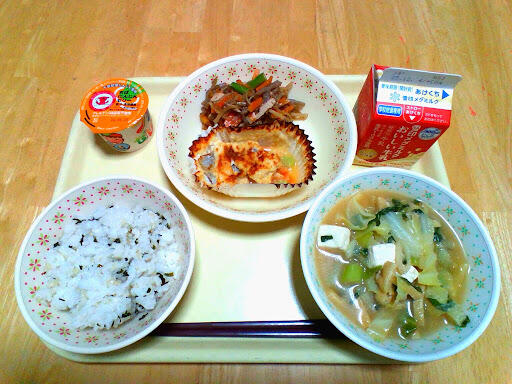 <メニュー>わかめごはん、牛乳、たらのみぞれ焼き、きんぴらゴボウ、のだ野菜の味噌汁、千葉にんじんゼリー