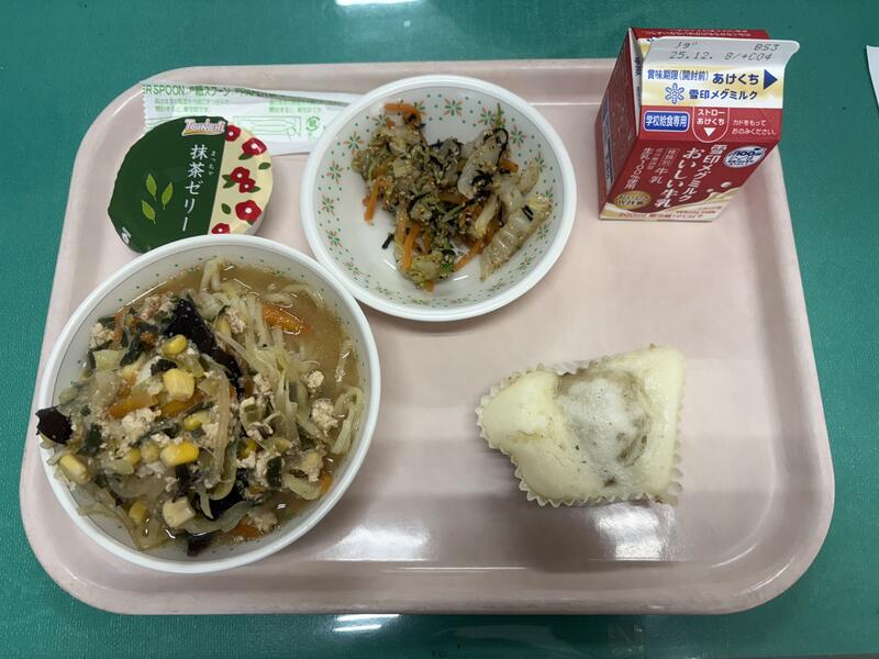 <メニュー>みそラーメン、牛乳、てづくり肉まん、白菜中華和え、抹茶ゼリー
