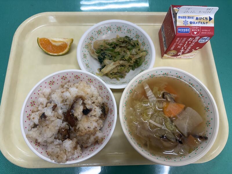 <メニュー>さんまごはん、牛乳、キャベツのごまあえ、いももちじる、はやか