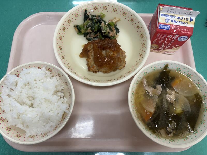 <メニュー>ごはん、牛乳、おさかなハンバーグ(おろしソース)、小松菜のツナ和え、彩り味噌汁