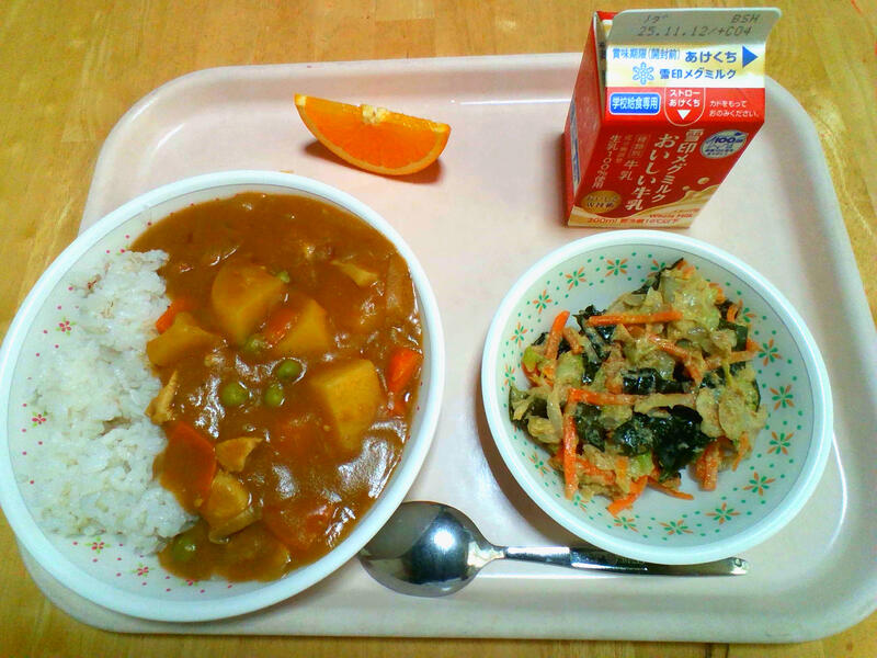 <メニュー>むぎごはん、牛乳、尾崎小チキンカレー、わかめサラダ、オレンジ