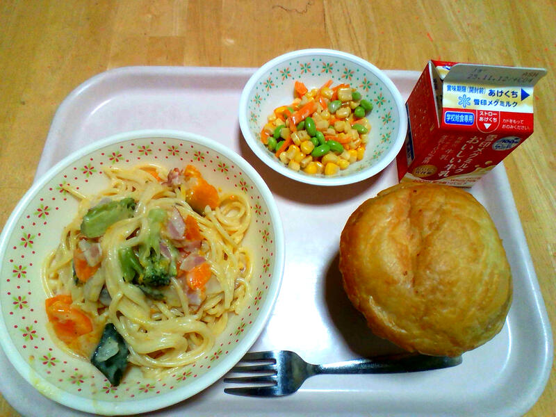 今日の給食はチキンクリームソースをかけたご飯でした!