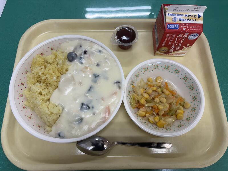 <メニュー>カレー粉ご飯、牛乳、チキンクリームソース、キャベツとベーコンのソテー、ひとくちぶどうゼリー