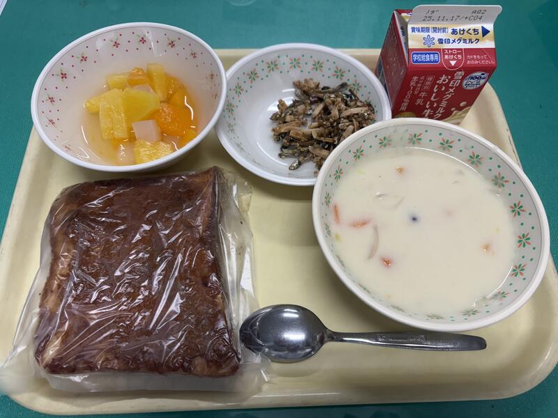 <メニュー>きなこトースト、牛乳、さつまいもシチュー、小魚アーモンド、フルーツポンチ