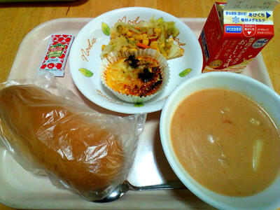 <メニュー> ジャージャー麺、牛乳、豆腐とキムチのスープ、かぼちゃケーキ