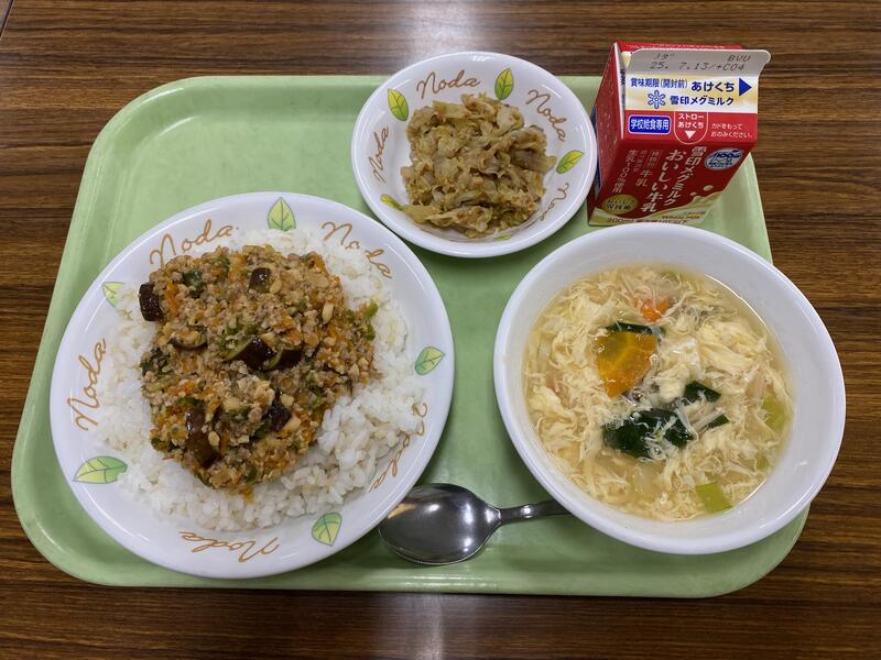 <メニュー> 発芽玄米ご飯、牛乳、麻婆ナス、野田の枝豆、たまごスープ