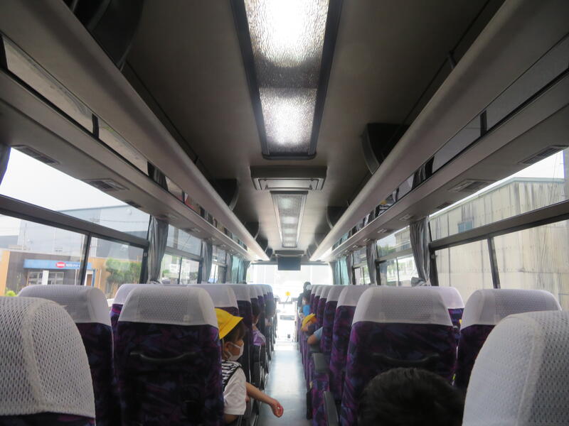 出発式&バスの中。バスは今年も2座席に1名の密防止で、、行ってきま~す!