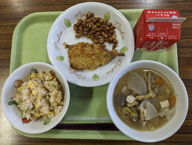 ご飯、牛乳、鶏の胡麻焼き、磯香和え、実沢山味噌汁、お魚アーモンド