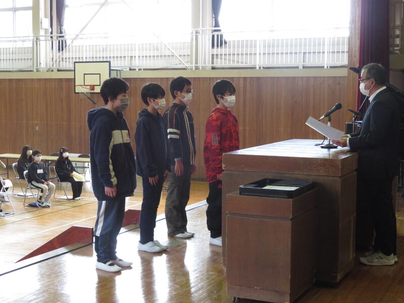 続いて修了証書の授与。「あゆみ」の裏面に印字の「当該学年の学びを修めた」証書が、各学年代表児童に手渡されました。進級の証、ですね。お疲れさま!