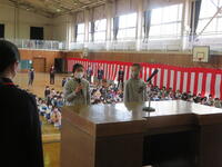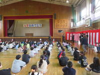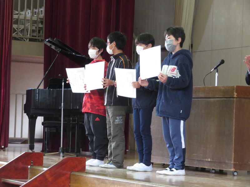 まずは恒例・各学年代表より「後期の振り返り」の発表。勉強、運動、生活、、、それぞれの学年に応じた頑張りの披露に、真剣に聞き入る尾崎っ子!