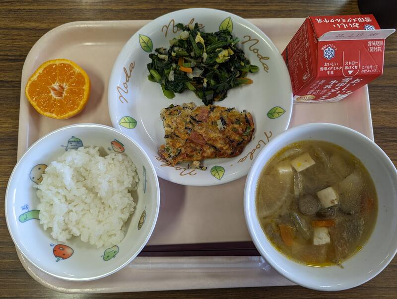 ご飯、牛乳、玉子焼き、磯香和え、豚汁、はなみかん