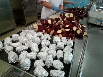 今日の給食は焼き芋です!野田の農家、まめいち農園さんが作ってくれたさつまいもを使用しています