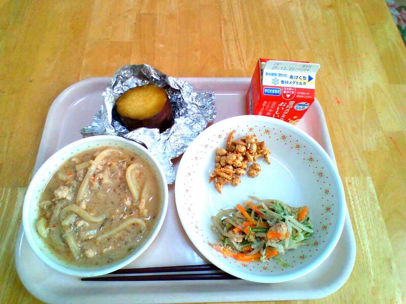 <メニュー>たんたんうどん、牛乳、もやしのサラダ、手作りアーモンドビーンズ、焼き芋