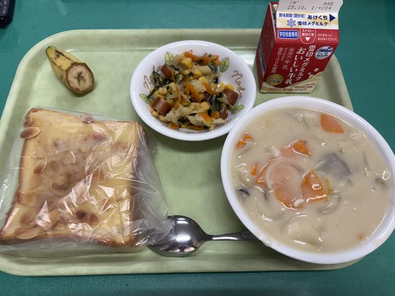 <今日の給食>スイートポテトトースト、牛乳、秋のシチュー、ウインナーとほうれんそうのソテー、バナナ
