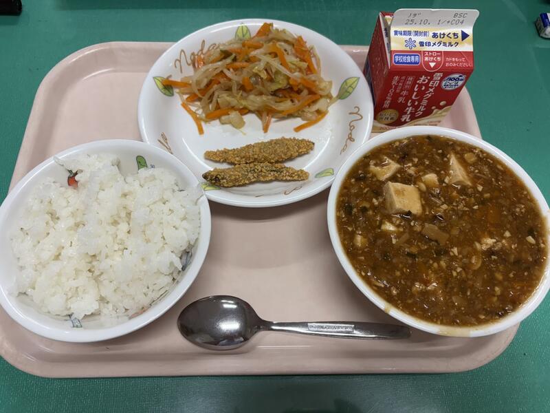 <メニュー>ごはん、牛乳、きびなごカリカリフライ、ねぎだれナムル、麻婆豆腐