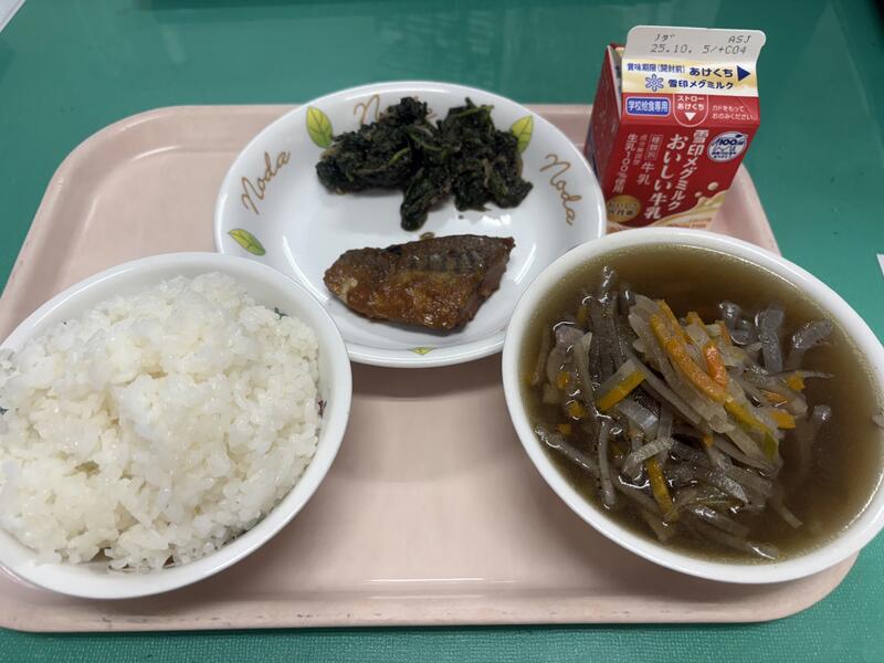<メニュー>ごはん、牛乳、さばのみそに、ほうれん草のごまあえ、さわにわん