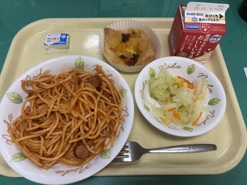 <メニュー>スパゲティナポリタン、牛乳、イタリアンサラダ、アップルパイ、チーズ