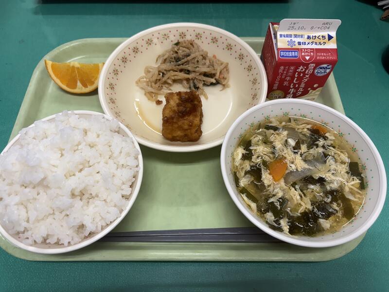 <メニュー>ごはん、牛乳、あげどうふの薬味ソースがけ、もやしのごまあえ、にらたまじる、オレンジ