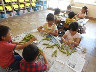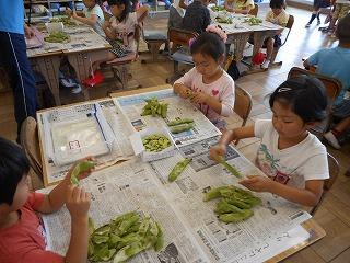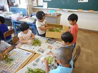 【役割分担を決めて、みんなで一生懸命にさやむきをしました】