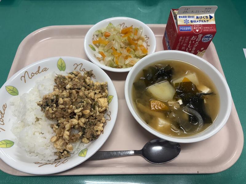 本日の給食は、ツナそぼろ丼!全体的にやさしい味で、ごはんとの相性がとても良くスプーンが止まりませんでした