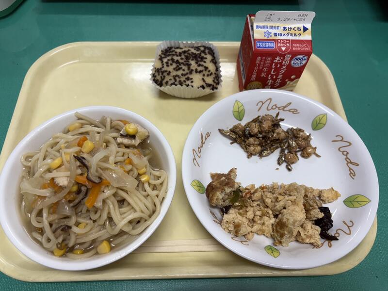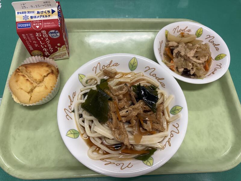 まだまだ暑い日が続いていますが、今日の給食はそんな暑さも吹き飛ばしてくれるようなメニューでした!つるっと冷たい「冷やしうどん」と、にんにくのきいた「スタミナ炒め」がとても元気がこみあげてくる給食でした