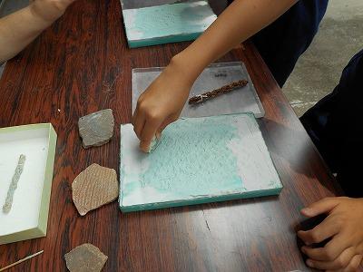 火おこしや土器の模様つけ、石器での鶏肉切りを体験しました。
