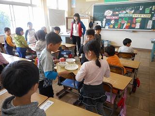 5年生が配膳し4年生が給食を配って、みんなで仲よく食べました。
