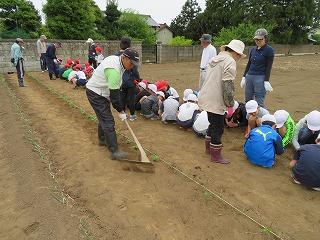 昨日は、小雨が降っていたのですが、ボランティアの方が2年生のかぼちゃを植えてくださいました。また、6月5日に予定している1・6年生のさつまいもの苗を植える畝を作ってくださいました。