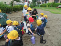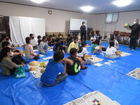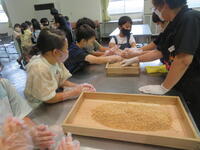 枝豆収穫体験です。本来なら畑に行き、現地で収穫する予定でしたが、最近の高温という気象状況のため、安全を最優先にして、このようにしました。畑の先生方が枝豆を畑から持って来てくださり、子どもたちが活動しやすいサイズにしてくださいました。ありがとうございました。