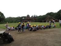 本日も青空いっぱいのいいお天気に恵まれました。3年生の元気の良さが、この青空を運んでくれたのでしょう。成田に近い、房総の村に校外学習で訪れました。昔の古き良き時代背景を再現した建物、街並みなど、レトロな雰囲気がたくさんありました。園内の散策をグループごとに楽しみ、昔の遊び(メンコ、けん玉など)にも挑戦できました。体験コーナーでは「どろめんこ」「千代紙ろうそく」作り、絵付けなどをしました。子どもたちは思い思いの作品に仕上げることができました。昼食は芝生の上でグループごとになり、お弁当をいただきました。お家の方が朝早くから用意してくださったお弁当、子どもたちはとてもいい表情でお弁当をいただいていました。午後は再度フィールドワークで園内を散策しました。グループリーダーさん、実行委員のみなさんのハキハキした呼びかけが素晴らしかったです。