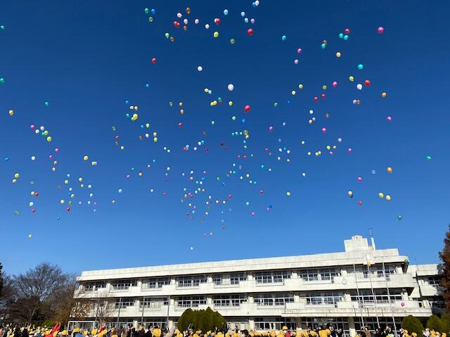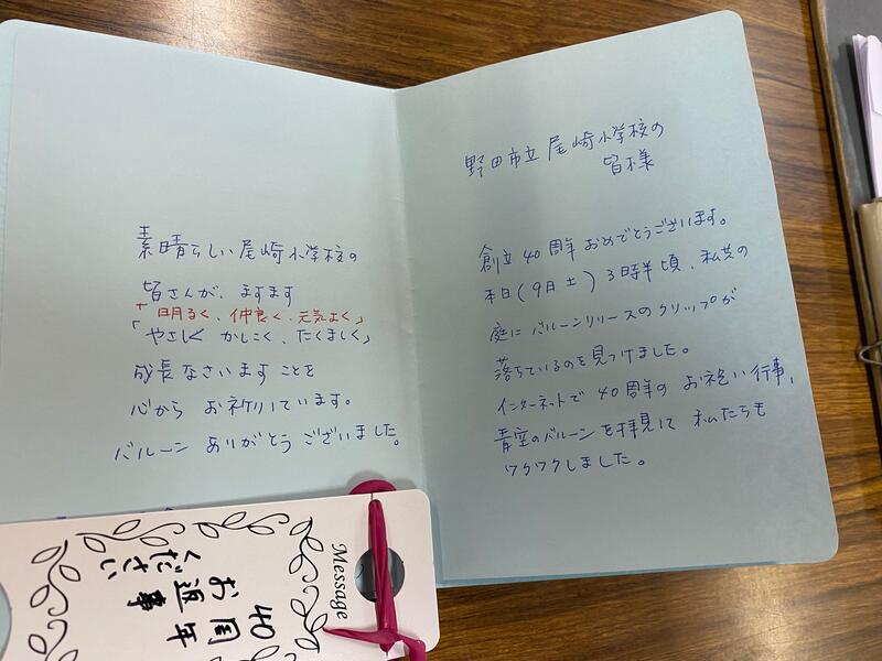 40周年記念行事のラストにバルーンリリースを行いました。遠く、遠くに、そして青い青い空に吸い込まれるように飛んで行きました。そのバルーンの一つが、な・な・なんと、茨城県に到着し、バルーンにあったメッセージに対して、お返事をくださった方がいました。12/13(火)にそのお返事が本校に届きましたが、驚きと感動と嬉しさ、そして感謝の思いでいっぱいになりました。ほっこりとあたたかな気持ちにしてくださいました。年の瀬にこんなあたたかな思いができて本校児童、教職員は幸せです! ありがとうございました。