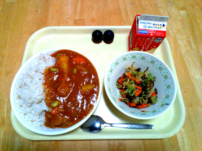 <メニュー>むぎごはん、牛乳、おさきしょうツナカレー、キャベツのしおこんぶあえ、巨峰