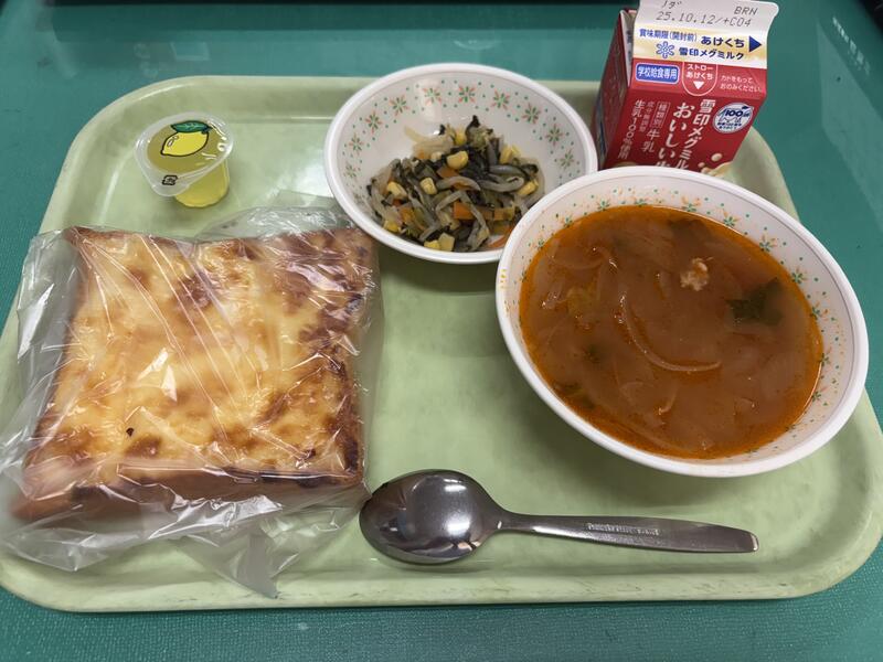 <メニュー>バスクチーズケーキふうトースト、牛乳、小松菜とコーンのソテー、ハンガリースープ、ひとくちゼリー