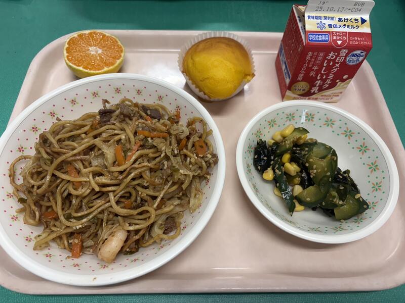 <メニュー>やきそばばんばん、牛乳、きゅうりとわかめのすのもの、キャロットケーキ、はなみかん