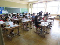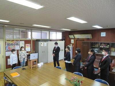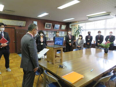 新しい級友と新しい教室に入った尾崎っ子。新しい職員を迎えた校長室とリモートでつないでの、まずは着任式から。12名の職員を迎えてのスタートです。