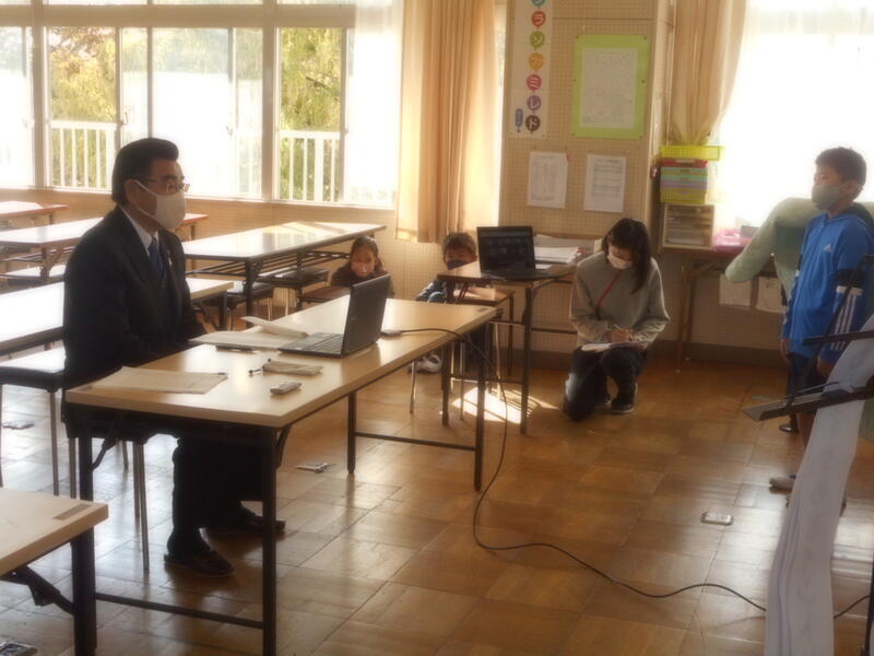 今年もリモートの形で、4年生以上の各学級と結び、学級代表児童の質問に市長さんが答える形で進みました。