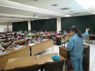 体育館では、全体会(学校・教育委員会より説明)と講演会(小学校入学