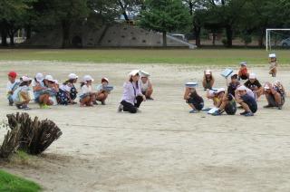 グランドにいるクラスはグランドの真ん中に移動し、座ります。