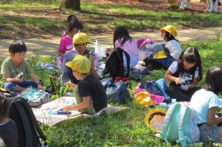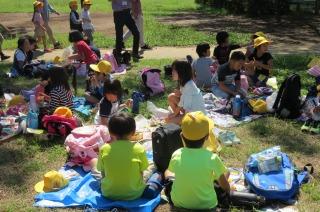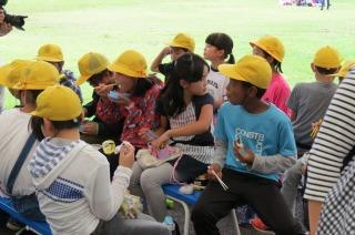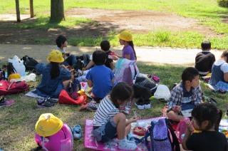 芝生にレジャーシートを広げて、班ごとにお弁当を食べました。